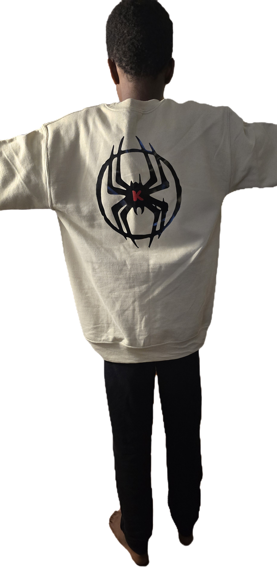 Kids Large, Cream sweatshirt, Black Spider, Red K